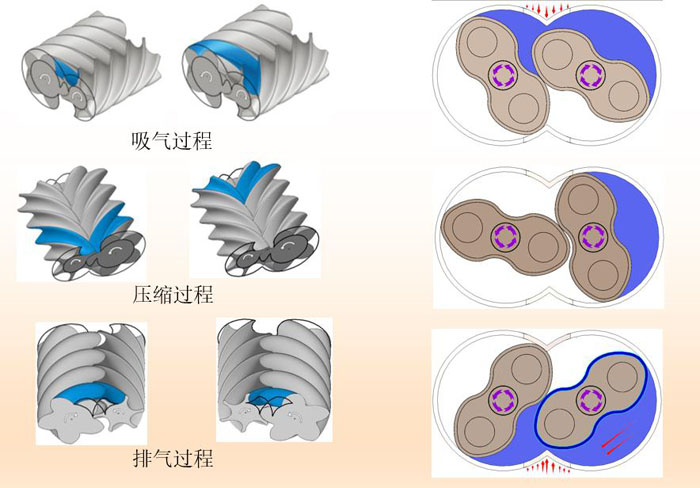 容積式壓縮機(jī)通過(guò)介質(zhì)在工作容積中的體積變化完成壓力升高的過(guò)程,羅茨式及雙螺桿式壓縮機(jī)均通過(guò)一對(duì)相互嚙合的轉(zhuǎn)子形成工作容積,如下圖所示。
