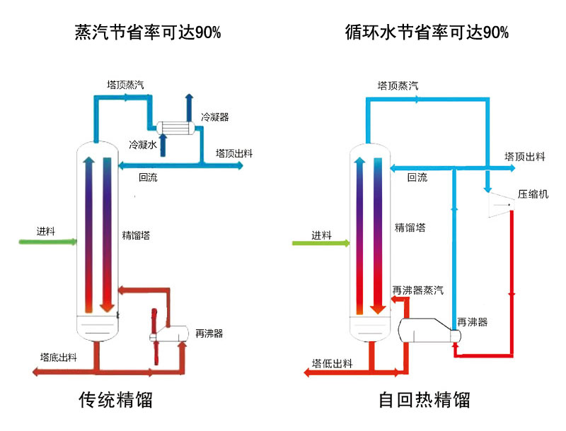 自回?zé)峋s系統(tǒng)(SHRT把塔頂任溫蒸汽通過蒸汽壓縮機壓縮、提高其溫度、壓力后在再沸器中冷凝將熱量傳遞給塔底物料,僅通過壓縮機來維持精餾系統(tǒng)的能量平衡。SHRT系統(tǒng)利用少量電能提高塔頂蒸汽的熱品位,高效的回收了塔頂蒸汽的汽化潛熱,減少了塔底熱量的供應(yīng)的同時降任了塔頂冷量的消耗,從而達(dá)到節(jié)能的目的。
