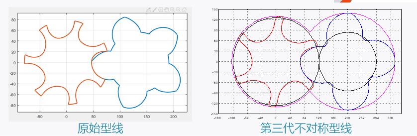 根據(jù)不同項目的需要,我司對流量、壓比、壓差、效率等不同層面的要求進(jìn)行優(yōu)化,基于自研型線庫采用不同的設(shè)計。型線均為點帶狀嚙合,運行平穩(wěn);利用曲面密封效應(yīng),有效提高壓縮機(jī)容積效率;接觸線、泄漏三角形等泄漏通道幾何尺寸均明顯減?。贿\行過程中更符合運行流場中的流線,有效減小氣體阻力。
