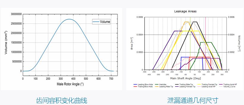 雙螺桿工藝壓縮機(jī)幾何結(jié)構(gòu)較為復(fù)雜,用于節(jié)能產(chǎn)品時,輸送介質(zhì)和運行工況變化范圍均較大。我司具有雙螺桿壓縮機(jī)氣動設(shè)計的完整能力,對壓縮機(jī)內(nèi)的容積變化、泄漏通道面積變化等均進(jìn)行精確計算,在此基礎(chǔ)上結(jié)合工質(zhì)的熱物性及工況要求,對其工作過程進(jìn)行精確的預(yù)測,如下圖是某型壓縮機(jī)的內(nèi)部容積變化過程及泄漏通道的分布情況:
