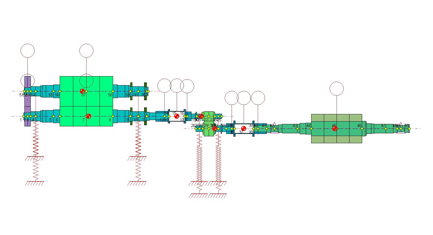 為此,制定了轉(zhuǎn)子動力學(xué)設(shè)計企業(yè)規(guī)范,對常規(guī)的橫向振動,和大型壓縮機(jī)特有的扭轉(zhuǎn)振動進(jìn)行全面分析,如下圖所示為同時考慮壓縮機(jī)組、增速箱及大型電機(jī)的設(shè)計模型: